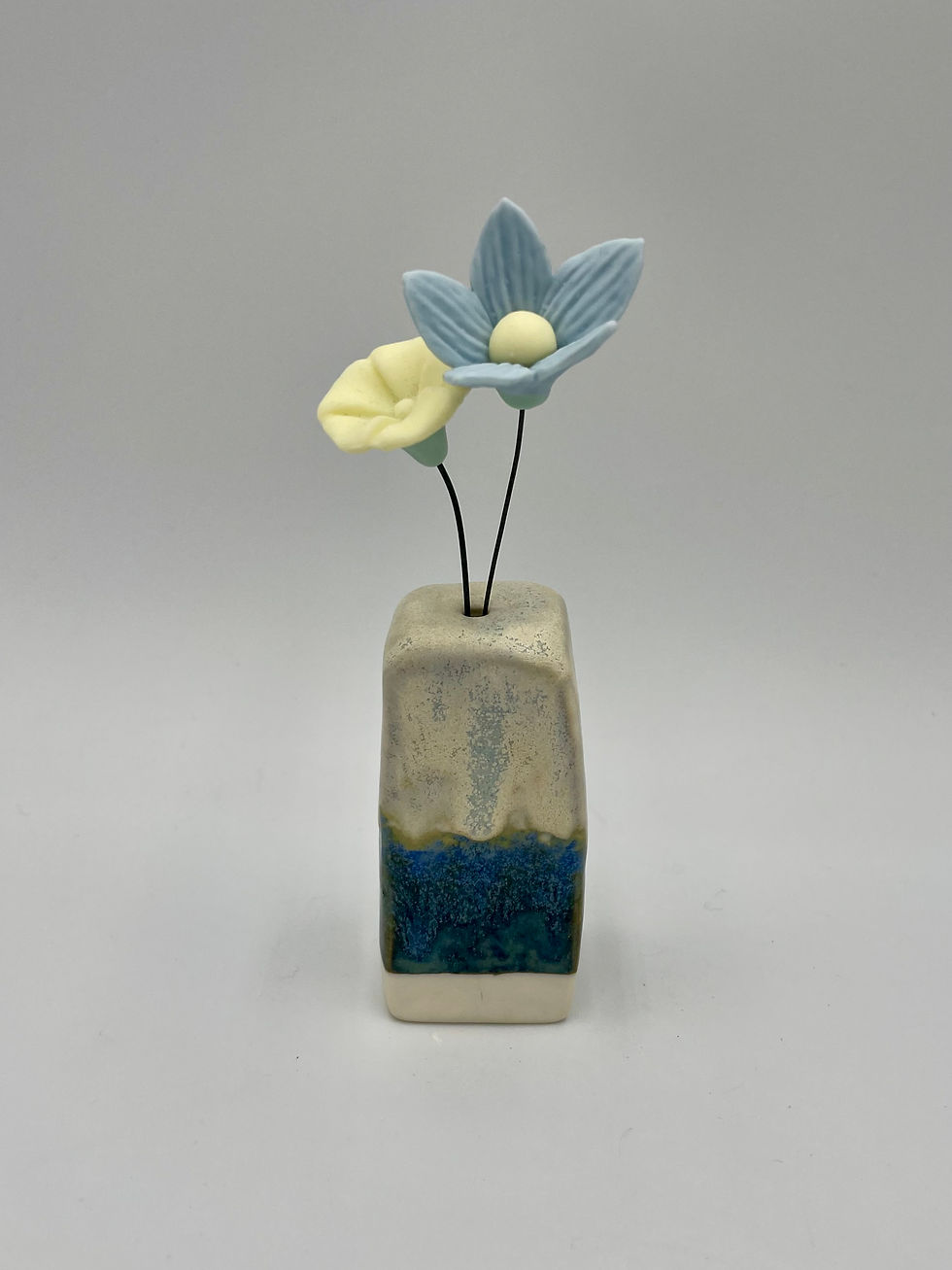 Porcelain block vases made in three different sizes, available in a range of glaze and porcelain flower combinations. Each block vase is a solid piece of porcelain with a hole in the top running down to a mid point in the vase. The flower stems can be removed and manipulated into different positions. There is space for dried seasonal stems (such as wheat, lavender, honesty and holly) to be added amongst the porcelain flowers.